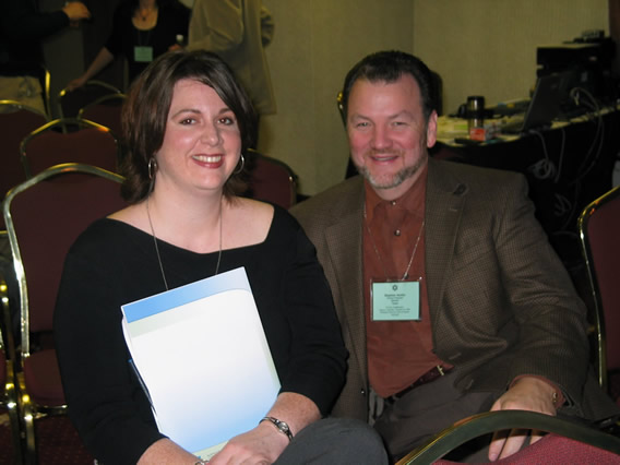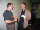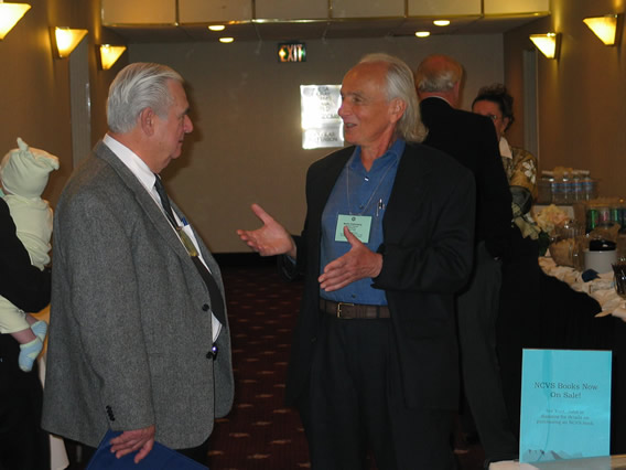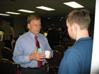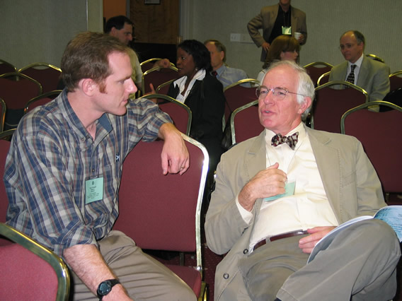 James Daugherty (left) and Graham Welch talk it over between presentations.