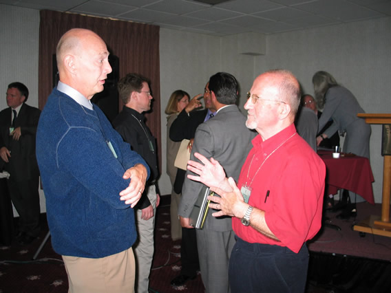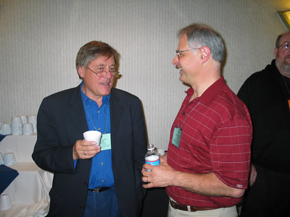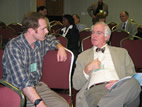 (left) and Don Miller share a conversation before the next presentation.