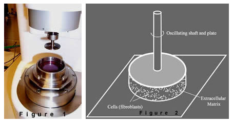 Synthetic materials (like sponges and foams) are used to begin the engineering process. These materials, which are porous, are seeded with cells that produce their own products (various protein fibers and fluid-like protein substances) to fill the spaces in the sponges or foam. All of this is happening in a so-called bioreactor, which is a device that allows cells to react to imposed environmental forces (Figure 1). In this case, the forces are vibrational forces. The tissue is cultured between two plates (see Figure 2), like a hamburger patty between two buns. One of the plates rotates back and forth at frequency's up to 100 Hz. In this way, the cells and their protein products are exposed to rather violent vibratory forces, not unlike those experienced in the human vocal cords during loud voice production. The objective of the research is to determine the underlying molecular causes for voice disorders related to excessive use of the voice.